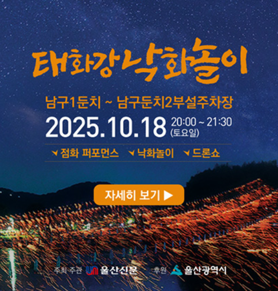 2025년 울산 태화강 낙화놀이는 전통과 첨단이 어우러진 울산 대표 가을 축제입니다. 10월 18일 단 하루만 열리는 만큼, 시간과 교통편을 미리 준비하고 명당을 선점한다면 더 특별한 추억을 만들 수 있습니다. 점화 퍼포먼스, 낙화놀이, 드론쇼가 선사하는 장대한 불빛의 향연 속에서 가족, 연인, 친구와 함께 잊지 못할 가을밤을 경험해 보시기 바랍니다.